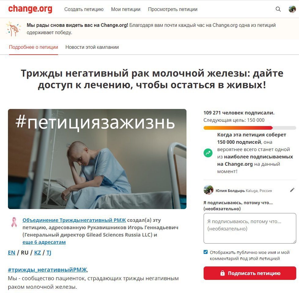 🤼♂️🏈⛸ «О, спорт - ты жизнь!" - ведь так? Пожалуйста, присоединитесь к нашей борьбе за жизнь! #петициязажизнь 😣На сегодняшний день препарат сацитузумаб говитекан (TRODELVY) всё также не доступен для пациенток с ТНРМЖ в России, и от безысходности мы продолжаем собирать подписи к петиции. В надежде, что компания GILEAD увидит насколько этот препарат нам нужен! 🔥Окончательные данные исследования ASCENT фазы 3 (представленные в Чикаго на ASCO 2022) демонстрируют, что Trodelvy снизил риск прогрессирования заболевания или смерти по сравнению с химиотерапией, выбранной врачом на 59% !!! ✍️ На данный момент БЛАГОДАРЯ ВАМ собрано больше 109 000 подписей. Наша следующая цель - 150 000 голосов ✊И нам хочется подключить к этой борьбе ТЕХ, кто не понаслышке ЗНАЕТ, ЧТО ТАКОЕ ТРУДНОСТИ 🥊🏋️♀️🥋 ⚽️Друзья, если Вы занимаетесь СПОРТОМ, если Вы состоите в какой-либо СПОРТИВНОЙ СЕКЦИИ. Если Вы играете в футбол, хоккей, баскетбол, волейбол или занимаетесь другим видом спорта! Поддержите нас в