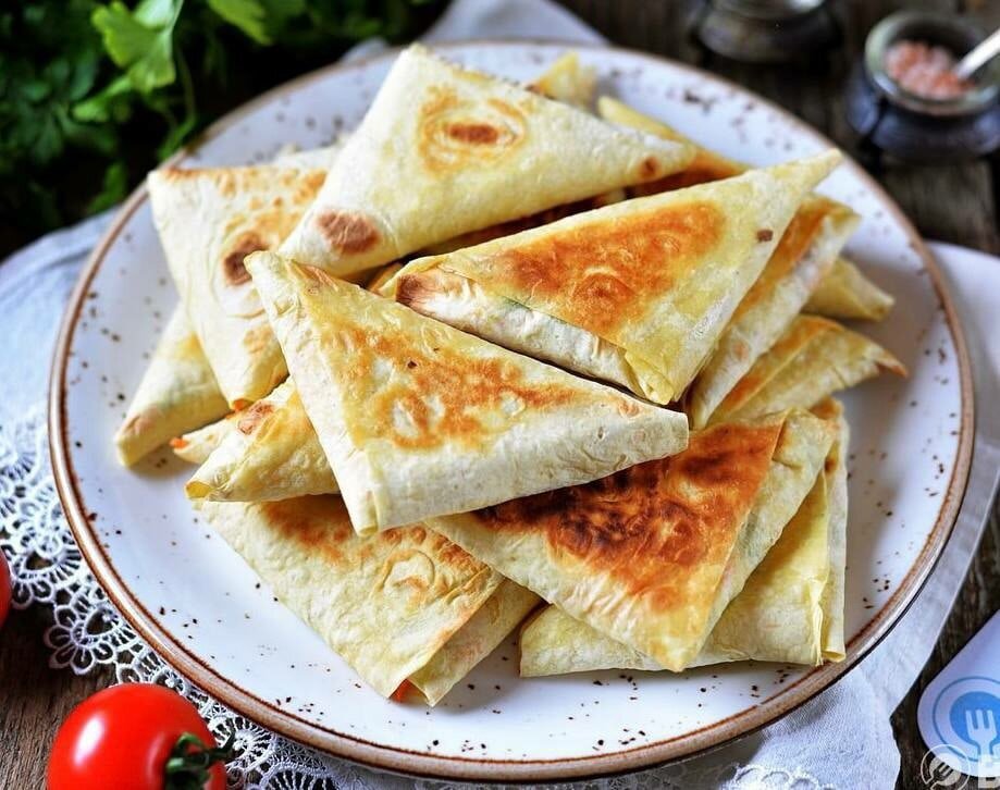 Конвертики с творогом 📖 Ингредиенты: 👩🍳 Приготовления: 1. Мелко нарезаем лук, зелень. 2. Добавляем в творог зелень, лук, яйца, солим. Перемешиваем. 3. Лаваш нарезаем на полоски (примерно 10-12 см.). 4. Выкладываем на уголок начинку и складываем в треугольник. 5. Обжариваем на небольшом кол-ве растительного масла с двух сторон до золотистости