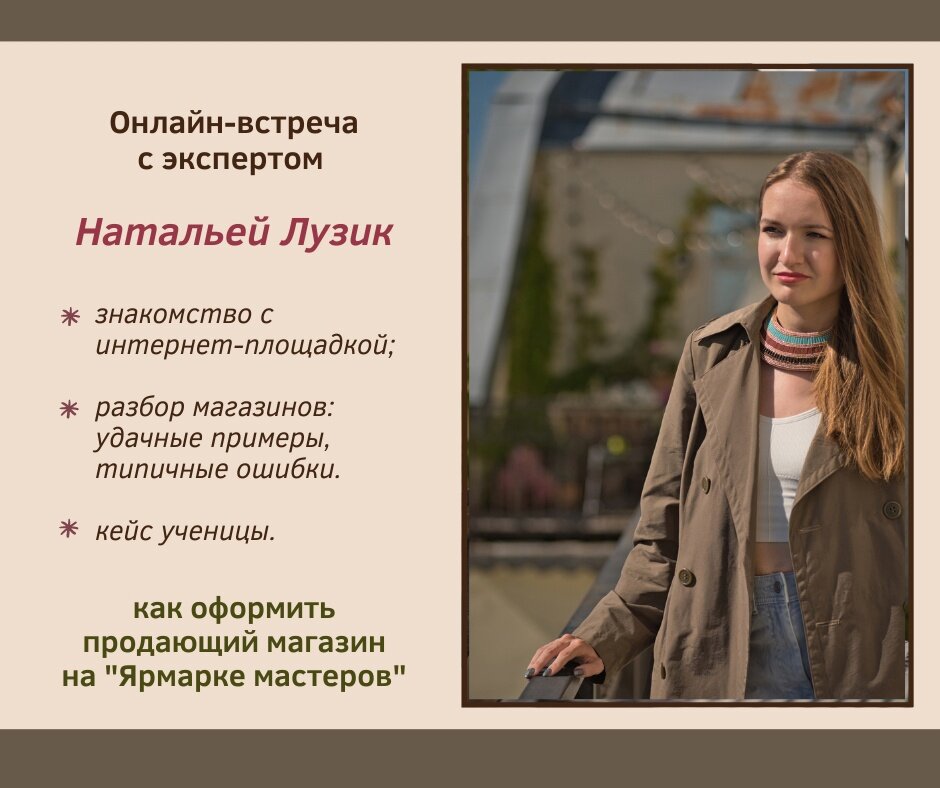 💍 Друзья! Четыре месяца назад у нас в клубе "Мастерская русской росписи" провела мастер-класс Наталья Лузик - дизайнер украшений и сувениров и эксперт по продвижению на одной из крупнейших площадок для продажи изделий ручной работы. ⭐ Наталья успешно продаёт свои работы на сайте "Ярмарка мастеров" уже 12 лет. А также обучает других мастериц, помогает монетизировать их хобби. 💥 Эта тема заинтересовала многих наших учеников, поэтому ПРИГЛАШАЕМ 18 августа в 19.00 мск на очередной мастер-класс Натальи Лузик. 🌐 НА ВСТРЕЧЕ эксперт: ✔ Расскажет немного о себе, о своей деятельности и непосредственно о продвижении на "Ярмарке мастеров". ✔ Проведёт разбор нескольких магазинов: покажет типичные ошибки, расскажет, как их избежать, покажет удачные примеры. ✔ Поделится секретами, "фишками" выигрышного оформления продающего магазина на этой площадке. ✔ Ответит на вопросы участников. 🎓 А также на встречу будет приглашена одна из наших учениц, которая, обучаясь у Натальи, за четыре месяца пришла к