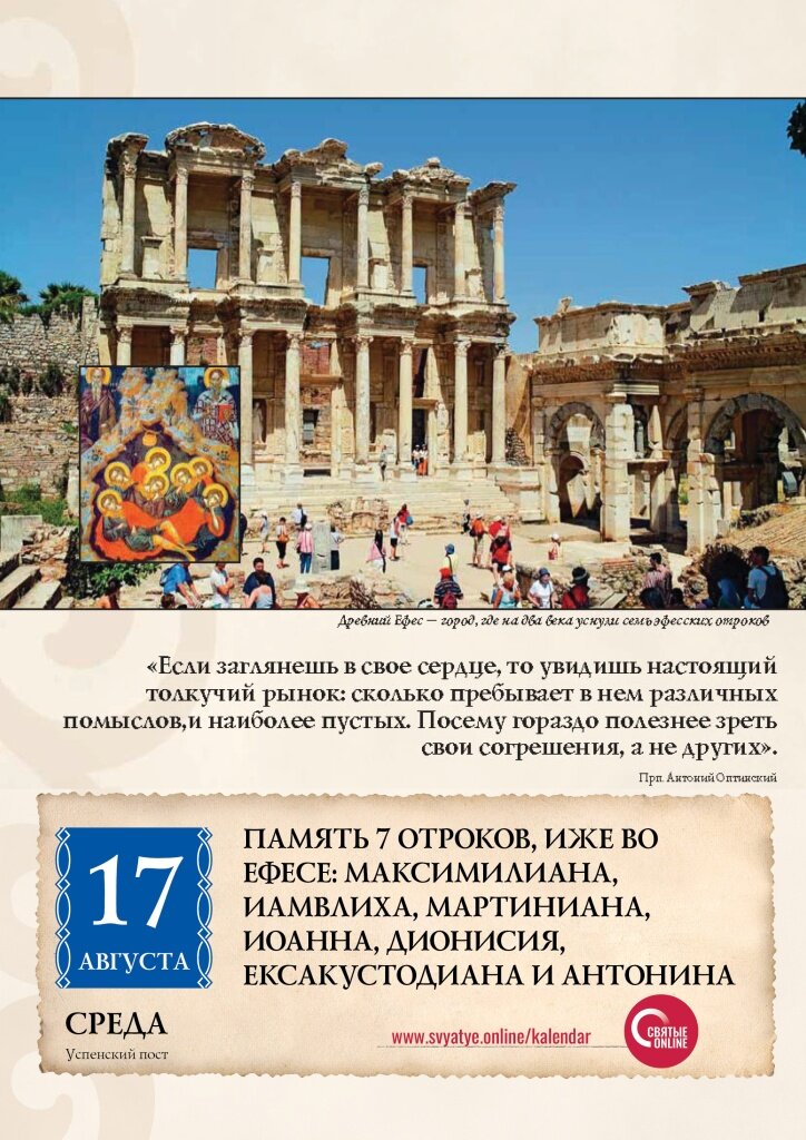 Семь отроков, Максимилиан, Иамвлих, Мартиниан, Иоанн, Дионисий, Ексакустодиан (Константин) и Антонин, жили в III веке. Максимилиан был сыном ефесского градоначальника, шестеро других – также отпрысками знатных горожан. Юноши дружили, все они состояли на военной службе. Когда император Декий (249–251) прибыл в Ефес, то повелел жителям явиться для принесения жертвы языческим богам; непокорных ожидали мучения и смертная казнь. По доносу семь ефесских отроков были призваны к ответу и открыто исповедали веру во Христа, за что с них сняли военные пояса. Однако Декий отпустил юношей, дав время отречься от своей веры, до возвращения его из похода. Молодые люди скрылись в пещере горы Охлон, где молились, готовясь к мученичеству. Вернувшись из похода и узнав, где скрываются отроки, Декий велел завалить вход в пещеру камнями, чтобы юноши умерли от голода и жажды. Двое очевидцев – тайных христиан – спрятали среди камней ковчежец с двумя оловянными дощечками, где записали имена юношей и описали обс