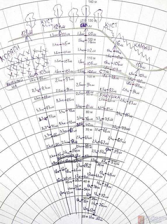 Это так называемая «карта сектора», в котором ведется ловля. С помощью маркерного удилища мы ищем на дне перспективные для ловли участки — горячие точки, к которым можно отнести коряги, бровки, перепады, колонии ракушки-перловицы. На карте сектора как раз обозначаются все потенциально «горячие точки», где можно поймать карпа. Вы можете видеть 5 основных лучей. На каждом луче есть засечки — в этих местах мы поднимали наш поплавок-маркер на поверхность, замеряя при этом глубину, и пробивали дальность с помощью лазерного дальномера, чтобы узнать расстояние от нас до маркера. Левое число — это глубина в том месте, где всплыл маркерный поплавок, правое число — расстояние до поплавка.