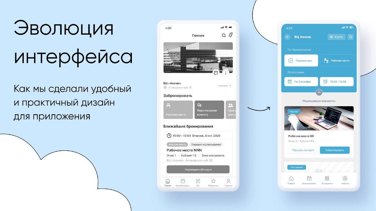 Уже больше года прошло, как работает и совершенствуется наша система для бронирования рабочих мест, переговорных комнат и других локаций офиса. Хотим рассказать, как менялись интерфейсы приложения и почему мы пришли к таким визуальным решениям. Сначала немного общей информации. Макеты в приложении меняются, исходя из пожеланий пользователей, UX исследований, обратной связи клиентов, директоров, руководителей, других дизайнеров и анализа best practices. Процесс построен так: UX дизайнеры создают прототип интерфейса с новой функцией; мы проверяем, насколько вписывается функция; если требуется, вносятся правки и готовится прототип дизайна, где мы смотрим, насколько новая функция легко и однозначно считывается, стараемся на этом этапе привлекать текущих клиентов и партнеров, которые уже пользуются системой. Но в какой-то момент текущий дизайн становится «переполнен». И тогда нужно делать редизайн, чтобы весь новый функционал смотрелся красиво и легко. А теперь посмотрим, как менялись вкла