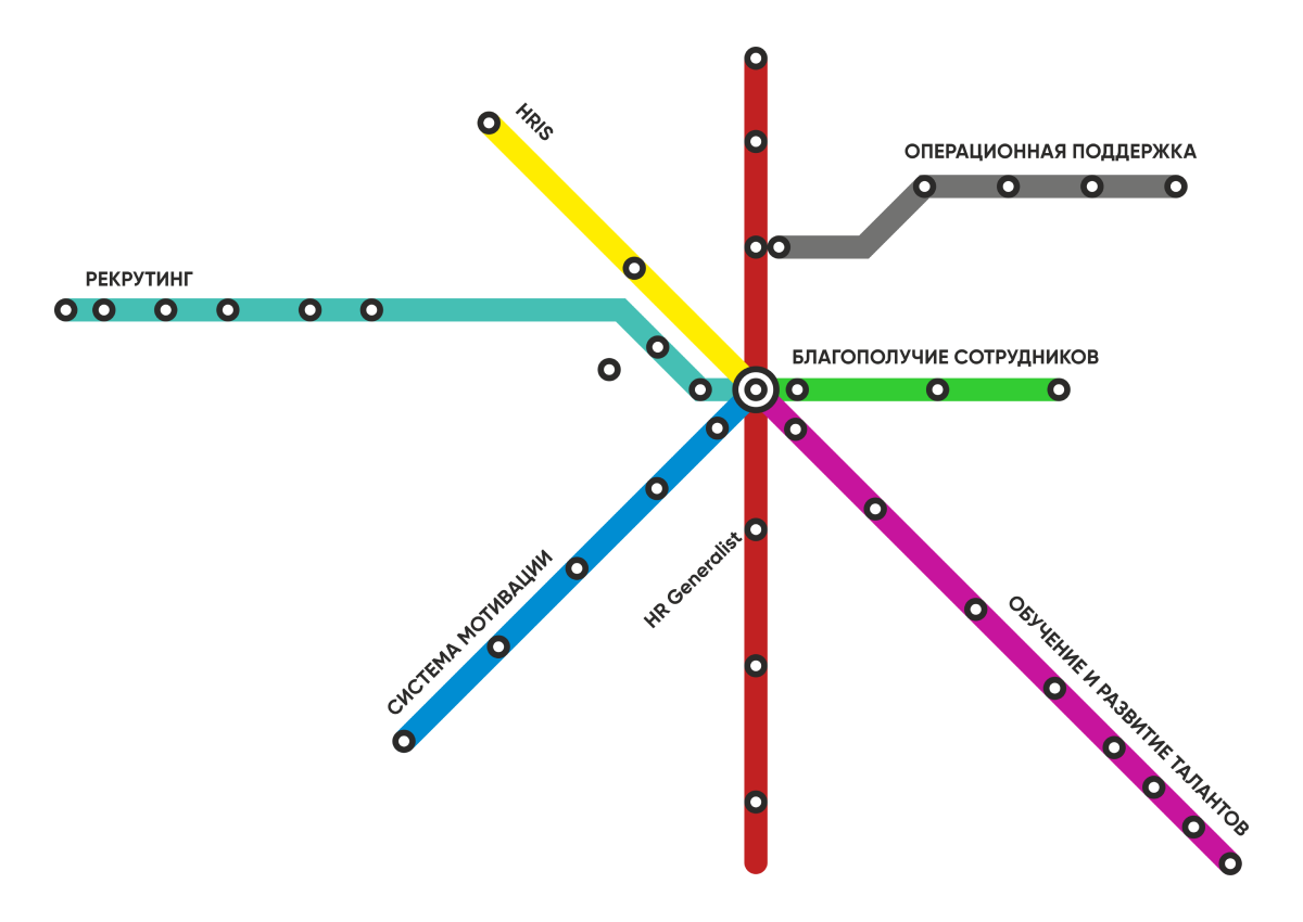 Самый важный и одновременно самый сложный ресурс компании - ее сотрудники. Как строить стратегию и систему управления ими решает руководитель. И от этого зависит, как создавать HR отдел. Сегодня можно обратиться к внешним специалистам и получить квалифицированные HR услуги от рекрутинга до создания системы развития персонала. Или же строить собственное HR подразделение. Каждая компания делает выбор самостоятельно. Чем сложнее бизнес, тем больше задач появляется у HR. И тогда служба неизбежно развивается. Именно это позволяет вывести бизнес на новый уровень. Думаю, что руководителю, особенно на начальных этапах, важно понимать, как вообще структурирована HR деятельность. Основную деятельность HR можно разделить на 7 направлений. Каждая ветка - одно направление деятельности. На каждой ветке мы отразили карьерный рост специалиста этого направления. Голубая - рекрутинг. От Recruitment Assistant до Recruitment Director. Сбор и анализ информации о потребностях компании, поиск кандидатов