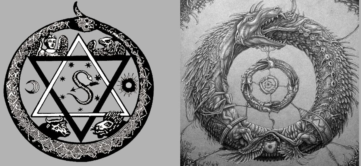 - Второй символ. Змея, проглатывающая свой хвост. Внутри ещё одна, повторяющая то же самое. Это уже самоликвидация тех из них, кто останется.