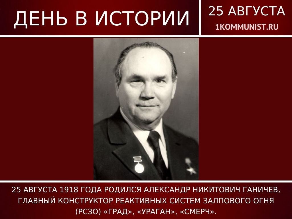 25 августа 1918 года родился Александр Никитович Ганичев, главный конструктор реактивных систем залпового огня «Град», «Ураган», «Смерч».