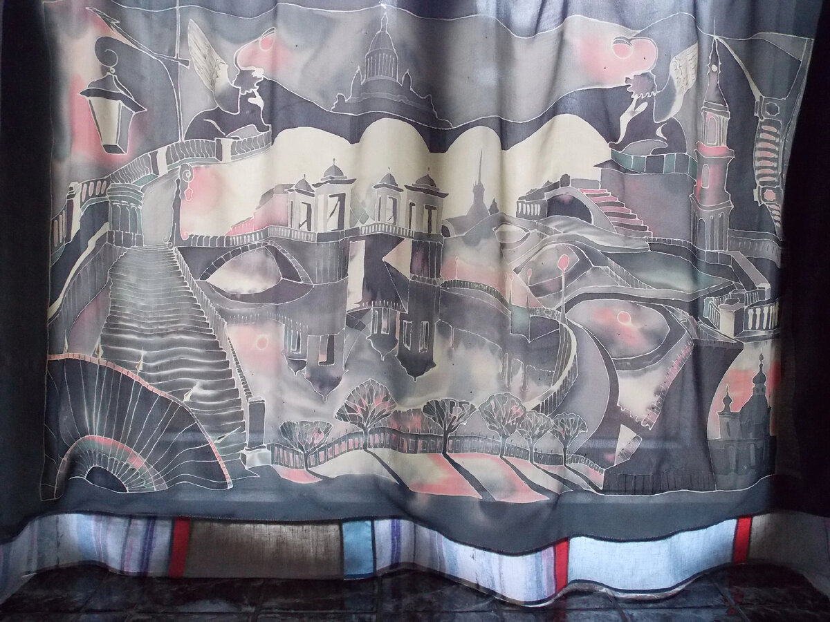 Батик счастливится рядышком уже три жизни. И четвёртая намечается - множественная. Живописный Петербург периодически выпадает с верхней полки шкафа и требует воскрешения в новой форме. Полотно было куплено в начале XXI века в Великом Новгороде, тема росписи - питерские мосты, кто автор, к сожалению, не помню. Подскажите, буду благодарна🌷 Побывала красота вначале шарфиком-палантином. Потом я придумала сарафанчик, связала лиф крючком, а на подол-юбочку Петербург пристроила. Бесподобно было, уж поверьте, воздушно и художественно. Я чувствовала себя передвижной выставкой. Жаль, фотографий не осталось. Вот только начало вязания лифа из серых ниток. С вязанием активно помогал кот Семëн: Выросла из платья, отпорола батик от вязаного верха и спрятала картину для лучших времëн. Третья жизнь батика включилась и заволновалась сквозняками в Костроме примерно в 2015 году и оказалась интерьерно-витражной. Я добавила палантину обрамление в лоскутной технике. Сшила вручную разные лоскуточки изо