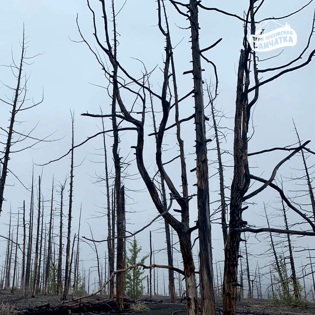 «Мёртвый лес». Эти слова кому-то напомнят что-то зловещее вроде Чернобыльской трагедии. На Камчатке есть свой мертвый лес, но его история куда менее катастрофична. Этот лес стоит неподалеку от вулкана Толбачик. Некогда зеленые деревья и растительность выжгло извержение. Оно произошло уже в наше время – в 1975 году, около полувека назад. Вулкан извергал лавовые потоки полтора года. Пеплом засыпало всё живое вокруг. Кроме пепла, землю покрыла горячая лава – на территории целых 45 квадратных километров. Застыв, она вместе с обгоревшими стволами стала напоминать неземной пейзаж - говорят, здесь в Советском Союзе даже испытывали луноходы. Как и после оползня в Долине гейзеров, со временем природа стала брать свое. Теперь то там, то здесь пробиваются ростки жизни. Но и исполин не дремлет – кто знает, что случится быстрее, земля вновь покроется зеленым покрывалом из травы и цветов, или новое извержение снова уберет с поверхности следы жизни. Походы к «мертвому лесу» популярны среди туристов,