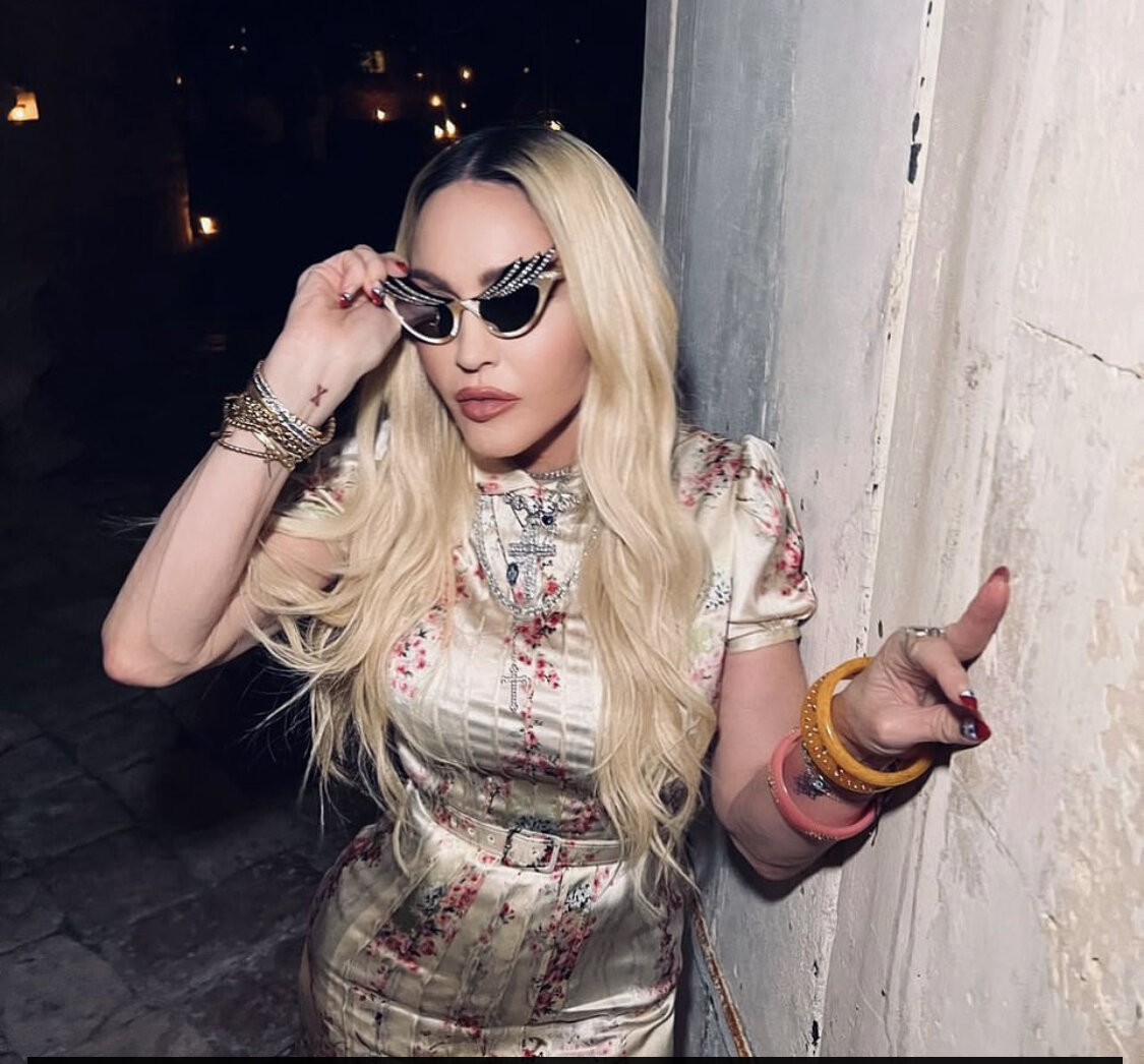 Отпраздновать свое 64-летие звезда решила в кругу всех своих детей, отправившись на Сицилию. Кроме любимого бриллиантового перстня с буквой М, певица надела на себя винтажные серьги с крестиками и множество серебряных и бакелитовых браслетов. Кроме того, Мадонна надела винтажные очки Cat eyes, украшенные стразами.Их выпускали с 1946 по 1955. Интересный образ, казалось бы, перегружен украшениями, а выглядит гармонично!