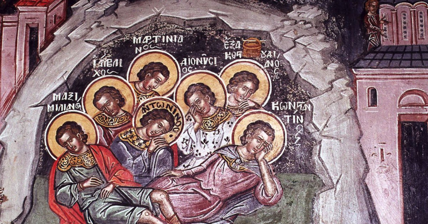 I. Святые, ныне прославляемые седмочисленные мученики были дети знаменитых граждан города Ефеса, воины юноши, жившие во время гонения на христиан от императора Декия. Это было ужасное гонение. Многие христиане скрывались за городом, в пещерах. Между ними были и воспоминаемы сегодня церковью семь отроков, которые, скрываясь от гонения, ушли из города и поселились в пещере горы Охлон для приготовления себя к подвигам за веру постом и молитвою. Декий, узнав об этом, велел завалить камнями вход в пещеру, причем двое из придворных, тайно исповедывавших веру Христову, Феодор и Руфин, среди камней положили оловянные дощечки, написав на них имена погребенных заживо в пещере семи отроков. Между тем, по неисповедимым определениям Своим, Бог, послав им сон смертный, сохранил их нетленными и неизменными для чудного пробуждения их во славу Его и в свидетельство истины слова Его, через два столетия после того.