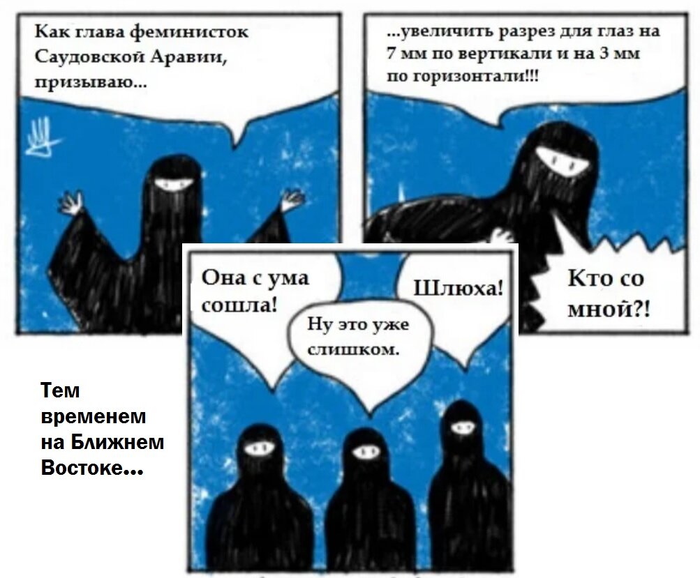 Вы не подумайте, если речь идёт о мусульманских странах, где живут по шариату, то я всем сердцем сочувствую этим обездоленным женщинам, чья жизнь подчинена множеству запретов. Я даже не представляю, насколько тяжело так жить: не получать должного образования, не иметь большинства гражданских прав и свобод, возможности претендовать на многие должности и профессии, всецело зависеть от мужа... Примерно, как пройти между капельками дождя и не намокнуть. Ведь даже в Саудовской Аравии, а это флагман арабского мира, женщинам начали выдавать права на вождение автомобиля только пару лет назад. Но в современном мире, где женщины зарабатывают больше иных мужиков, потому что не пьют, по бессмертному определению персонажа Леонида Филатова из советского фильма "Экипаж". У них же всё есть и даже больше, закон и общественное мнение на их стороне. Тот "мужской" мир остался в далёком прошлом. Ритуалы, традиции, моральные нормы, табу и стереотипы давно переписаны или поменяли свой вектор, выглядят арх