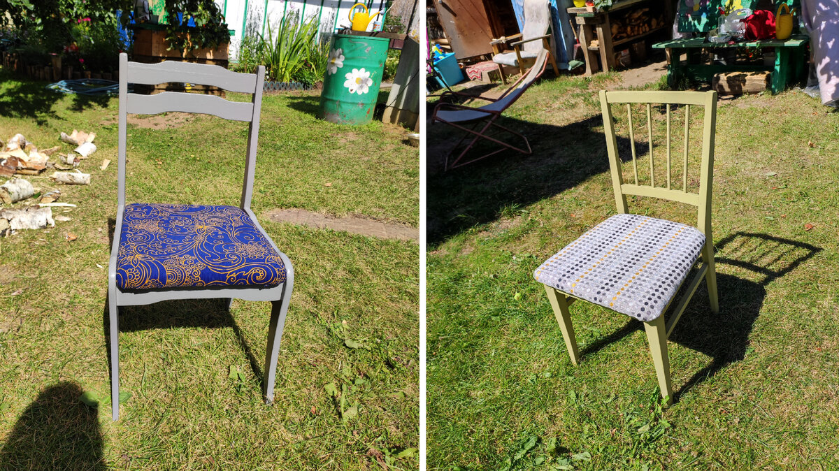 Всем привет! Я уже летом выкладывала видео моего первого опыта по реконструкции стула. Сегодня хочу продолжить эту тему, уж очень мне понравилось и захватило это занятие. У моей мамы таких советских, уже "молящих" об обновлении стульев, к счастью много, и я решила, с помощью моих помощников - родственников обновить их все. Итак, два стула, старых, советских. Если покраска стульев, это одно приятное дело, состоит из выбора краски и, соответственно самой процедуры. То перетяжка стула для меня было очень важным этапом. Я хотела дорогую, яркую ткань. Но зайдите в наши магазины тканей, посмотрите на расцветки гобеленов например, плакать от их цветов хочется. Поэтому поиск ткани был долгим. Одну ткань я купила за 3000 рублей длиной 70 см. Это была ткань для портьеры в магазине тканей. Этого куска хватило на два стула. Второй отрез ткани я нашла в Секонд хенде по цене 350 рублей за весь отрез. Длину не знаю, но обтянули ей три стула и ещё хватит на один стул. А теперь вопрос: как думает
