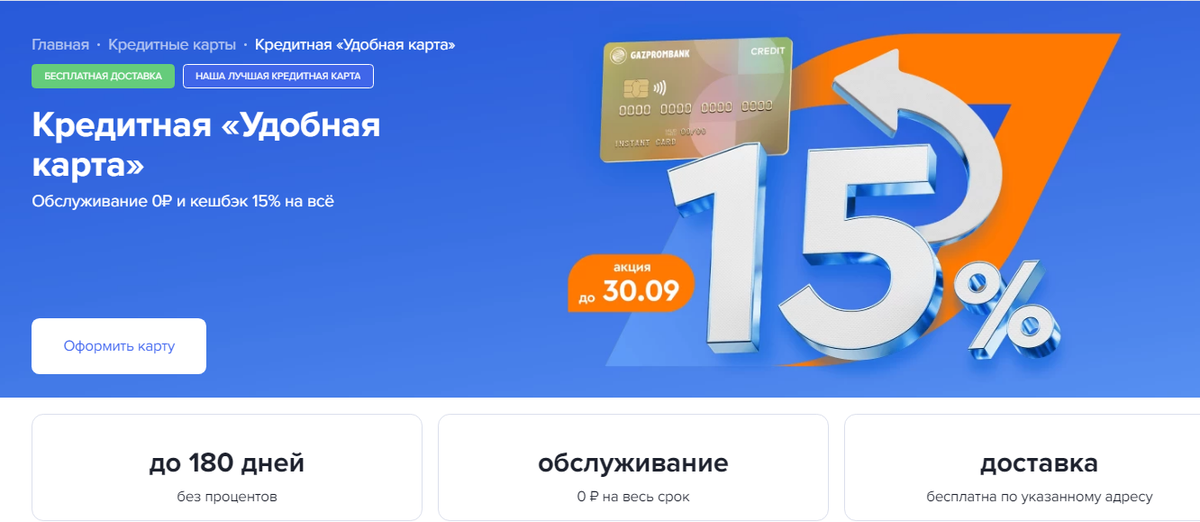 15% кешбэк на Покупки по Беспл. Кредитной «Удобная карта» 180 дн. БЕЗ % до 600000₽ от ГазПром Б. ОФОРМИ по 30 сентября 22г+Беспл. доставка