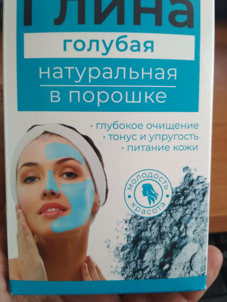Была я в аптеке по делу и обратила внимание вот на эту коробочку с голубой глиной. На полочке оставалось всего две коробочки. Я подумала, что это популярный товар. Да и недорогой - всего 45 рублей. У меня уже была маска готовая косметическая с голубой глиной. Решила еще в порошке попробовать. Это натуральная голубая глина, в упаковке два пакетика с порошком. Я решила испробовать ее действие. Насыпала в стеклянную емкость две столовые ложки с горой порошка. Он такого серо-голубого цвета. Добавила воды комнатной температуры и довела глину до консистенции густой сметаны. Хочу сказать, что на одно лицо две столовые ложки много! Хватило бы и одной. Масса на ощупь показалась мне такой нежной и даже жирноватой. Но добавок никаких на коробочке не заявлено. Кожу лица подготовила - немного обработала скрабом. Нанесла маску из голубой глины на лицо, кроме областей вокруг глаз и держала, пока глина не подсохла. Смывается маска прекрасно, без следа. Кожа лица на ощупь остается гладкой, нежной. На