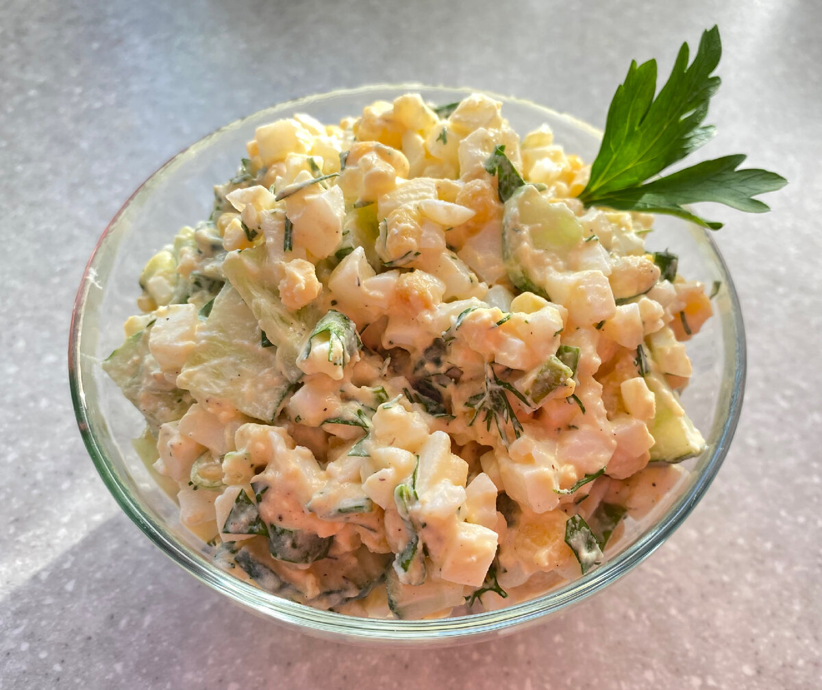 Этот салат мне нравится тем, что он прост в приготовлении, особенно когда очень хочется кушать и надо что-то быстро приготовить, или ждёшь гостей, которые приедут с минуты на минуту. А ещё он вкусный и сытный. Что нам понадобится: Начнём с самого долгого. Яйца варим до готовности, примерно 6-7 минут. Остужаем в холодной воде, чистим и нарезаем мелкими кубиками. Огурец режем пополам и на небольшие дольки. Добавляем к яйцам. Туда же нарезаем зелёный лук, петрушку и укроп. Консервированную кукурузу сразу кладём ко всем ингредиентам. Солим по вкусу и перчим. Заливаем все майонезом / сметаной, перемешиваем и наш салат готов! Пробуйте и делитесь впечатлением в комментариях. Всем приятного аппетита! :)