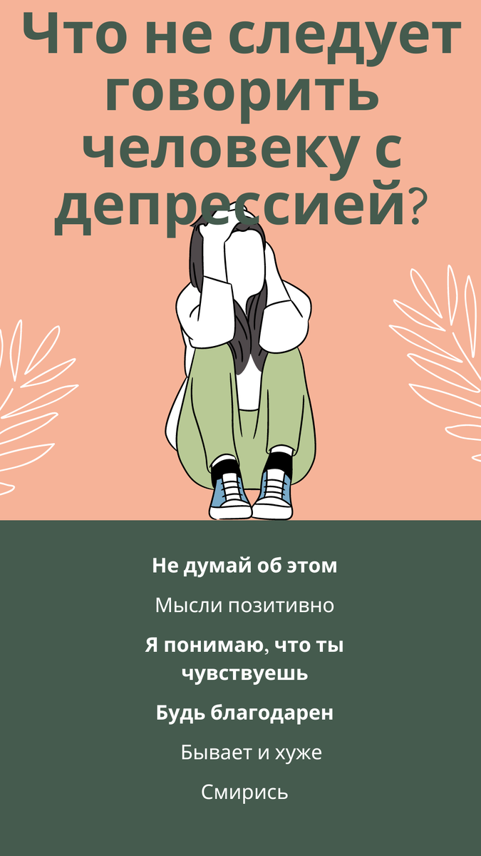 Жить с депрессией очень тяжело. Это тяжело для человека, у которого это есть, и это тяжело для его друзей и близких. 1. Не думай об этом Некоторые люди, страдающие депрессией, по сути страдают от размышлений. Размышление означает повторное повторение мысли, и это может способствовать усилению чувства никчемности или беспомощности. Человек не может просто избавиться от депрессии, и указание человеку перестать думать о своих проблемах на самом деле может спровоцировать его на размышления. 2. Позитивное мышление - твоё выздоровление! Говорить депрессивному человеку “мыслить позитивно” - значит пренебрегать состоянием здоровья, которое вызывает симптомы, и возлагать вину на человека, борющегося с болезнью. 3. Я понимаю, что ты чувствуешь Это утверждение вроде как вызывает сочувствие и призвано помочь человеку в депрессии почувствовать, что его понимают, но оно может иметь неприятные последствия. Существует достаточно большая разница между депрессией и печалью. Испытывать чувство грусти -