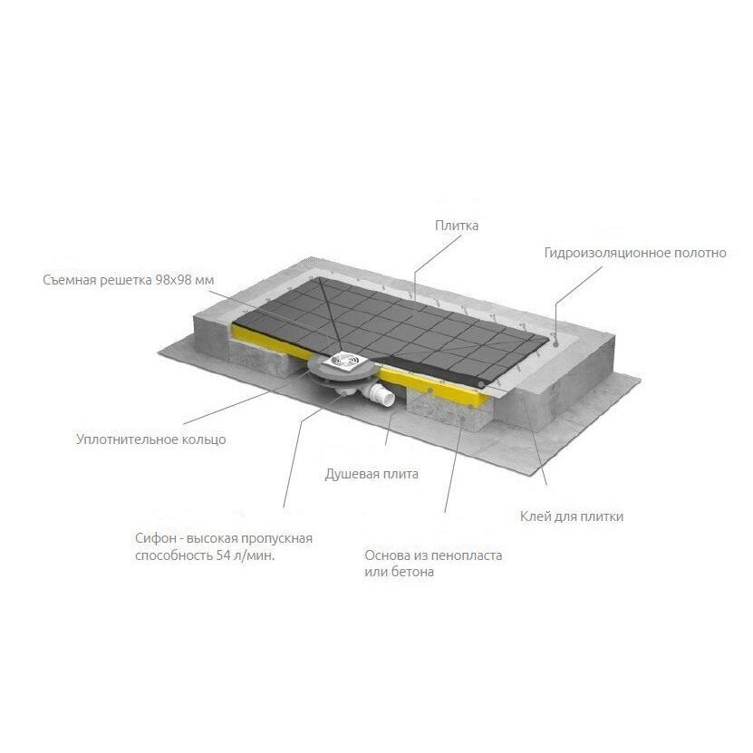 Поскольку под поддоном в душе устанавливается еще и сифон, вся система канализации ванной должна быть наклонена от крайней точки устройства. Соответственно, высота подиума должна быть такой, чтобы превысить высоту сифона и обеспечить укладку труб под необходимым углом.
