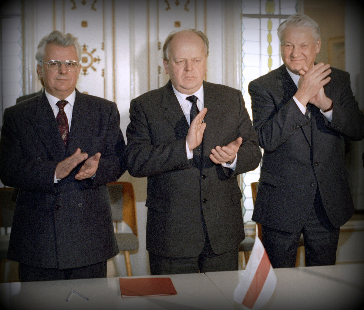 Только я недавно писал о том, что постсоветская эпоха становится античностью и месяца не прошло, как ушёл один из её главных символов. Впрочем, год вообще у нас выдался занятный и он ещё не закончился. Хотя событий уже произошло столько, что хватило бы на десятилетие. Но мы всё же поговорим с вами не о делах сегодняшних, а о делах стародавних. Так вот думаю, наиболее опытные передовики прекрасно помнят, что Беловежская пуща это не только локация на карте. В некотором смысле и она стала символом распада Советского Союза. И люди, ставившие там подписи под документами, в полной мере несут ответственность за крушение страны. Довольно иронично, что сейчас именно Александра Лукашенко считают каким-то невероятно древним правителем Белоруссии, но в пуще его, например не было. Более того перед ним во главе страны стоял такой человек как Станислав Шушкевич, но о нём сейчас чего-то все забыли. А он, между прочим, в этом году ушёл. На снимке выше он по центру. Кто стоит справа, думаю объясн