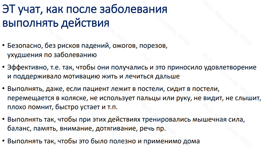 Реанимация – слово пугающее для любого человека. К сожалению, времена ковидные заставили побывать в таком отделении гораздо бОльшее число россиян, чем «планировалось». Потому все чаще в нашем обиходе стало звучать слово реабилитация. Знаете ли вы, сколько специалистов должно быть в отделении ранней реабилитации? В мультидисциплинарную команду входят: врач медицинской реабилитации, специалисты по физической реабилитации, медицинский психолог/врач-психотерапевт, медицинский логопед, специалист по ЭРГОРЕАБИЛИТАЦИИ. Последний в списке - эрготерапевт - пожалуй, один из самых важных (и очень редко пока встречающийся) специалист. В России образовательные программы по эрготерапии только-только начали внедряться. Цель работы эрготерапевта- улучшение качества жизни пациента до уровня максимально возможного самообслуживания в быту, в трудовых и учебных активностях, в процессе отдыха. В случае, если жизнедеятельность пациента устойчиво ограничена, эрготерапевты индивидуально, на основании оценк
