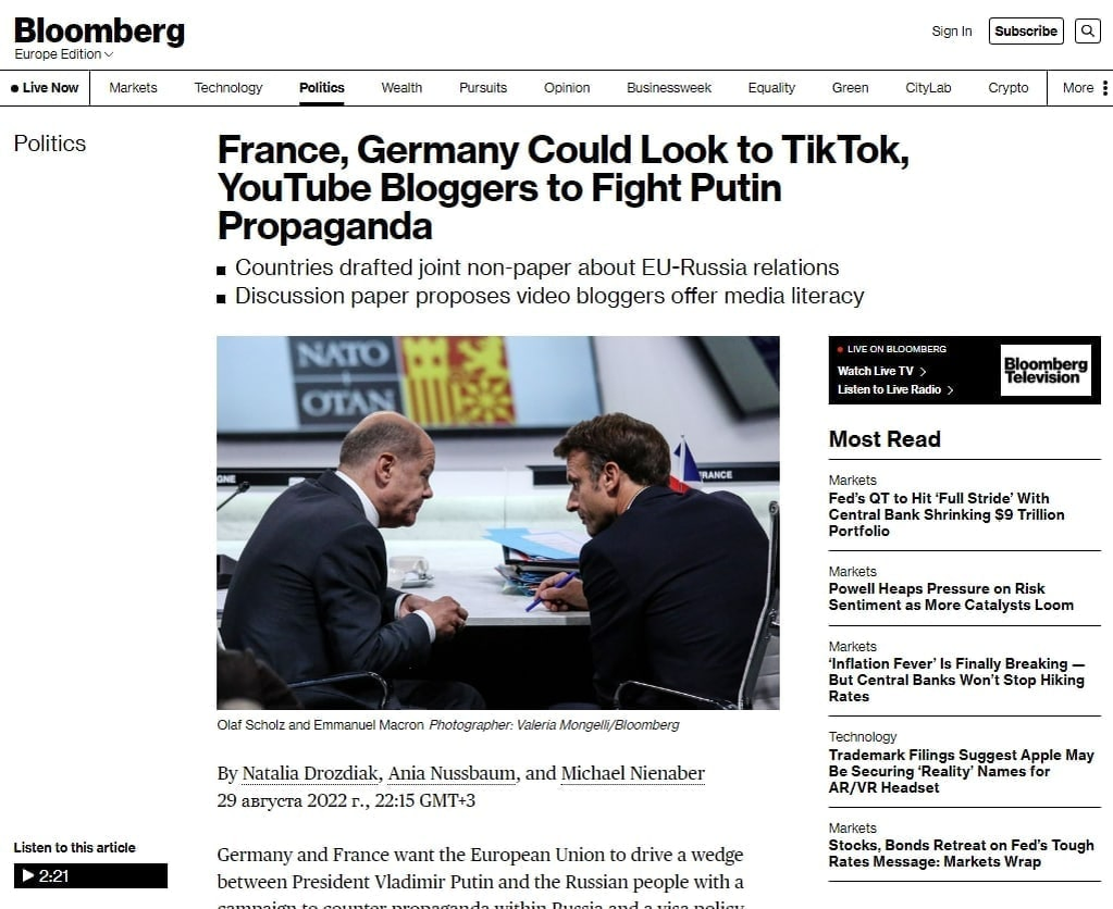 Германия и Франция предлагают странам ЕС "вбить клин" между президентом Владимиром Путиным и русским народом с помощью онлайн-кампании по противодействию пропаганде на YouTube, Facebook и TikTok и визовой политики, которая сигнализирует, что Европа по-прежнему открыта для обычных граждан, сообщает Bloomberg. Неофициальный документ называется "Защита международного порядка в эпоху системного соперничества: Отношения между ЕС и Россией". В нем говорится, что ЕС должен продолжать искать "творческие пути" для распространения независимой информации внутри Российской Федерации. А теперь представьте себе противоположную новость: Россия собирается "вбить клин" между немецкими (французскими, американскими и т.д.) властями и народом с помощью интернет-кампании по противодействию пропаганде. Представляете? И какой это будет скандал, шум и вонь!