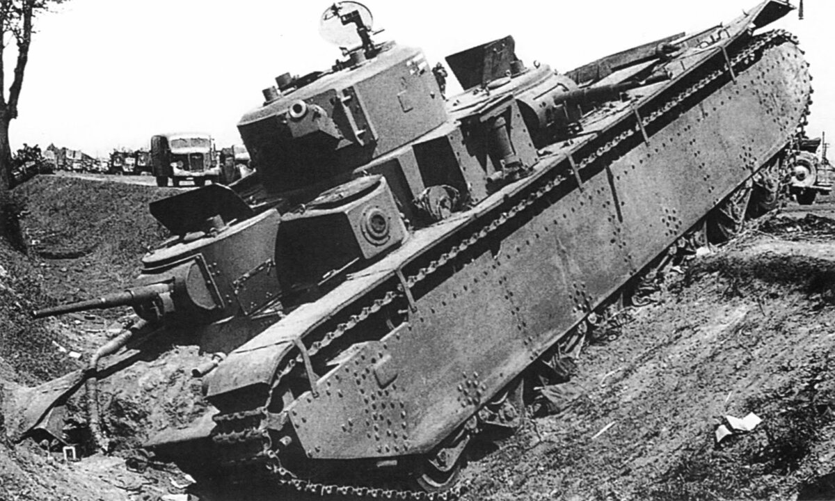 Т-35 - это советский многобашенный танк. Когда ставка приказала создать новый тяжёлый многобашенный танк, сделали несколько вариантов: Т-35, Т-28, СМК и КВ-1. Но Т-35 успел поучаствовать только в парадах, так как неопытный экипаж в начале войны либо бросал технику, либо же танки ломались или же не хватало боеприпасов. В итоге танком Т-35 повезло полюбоваться немецким солдатам. Вооружение: 76-мм пушка КТ-28, 45-мм пушка 20-К (2 шт.) и пулемёт ДТ калибра 762 (5 шт.) Экипаж: 10 человек. Масса: 25 т Толщина брони корпуса: 30/20/20 мм Толщина брони башни: 20/20/21 мм Мощность двигателя: 646 лю с. при 1500 об/мин Макс. скорость: 30 км/ч
