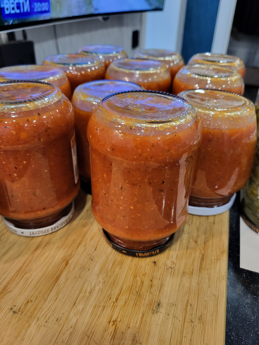 Этому рецепту лет 10, и я не устаю каждую осень делать этот пикантный вкуснющий кетчуп. Он подходит ко всем блюдам, будь то мясо или рыба, можно добавить в гуляш, можно в суп, можно просто на хлеб намазать. Вообщем, очень вкусно! Потрудиться, конечно, придется, но результат вас обязательно порадует. ИТАК, нам понадобится: 2 кг помидоров 1 кг красного сладкого перца 500 г моркови 500 глука 200 г томатной пасты 150 г растительного масла (без запаха) 150 г острого перца чили 100 г чеснока 70 г яблочного уксуса 6 ст л сахара 3 ст л имбиря 6 ст л кукурузного крахмала 3 ст л сухого базилика 1 ст л молотого кориандра 4 ст л соли. Дорогие хозяюшки, не бойтесь такого большого перечня! Все просто и легко! Дочитайте до конца! 1) Морковь с луком и сладким перцем, добавив базилик, измельчить с помощью блендера, влить 2 стакана воды и проварить 10 минут. 2) Измельчить помидоры, перец чили и чеснок. Все добавить к варящимся овощам, довести до кипения и еще проварить 10 минут на слабом огне, помешив