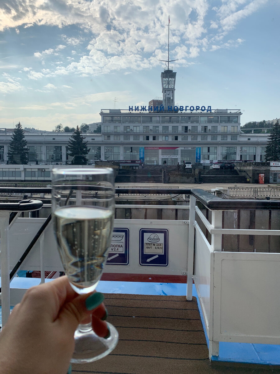 А начнём с того, что круиз на теплоходе Нижний Новгород редко встречающееся явление на сайте компании. А все потому, что он совершает корпоративные и заказные рейсы. И вот удача, круизы на Нижнем Новгороде появились в продаже! Срочно покупаем. Рейс Нижний Новгород - Москва (5 дней). Сразу отмечу, что круиз был куплен примерно за 2 недели до его начала по акции "2 место в подарок". Акция была всего 1 день, каким-то чудом решили забронировать и не думать несколько дней. На следующий день акции уже не было. Каюта Делюкс (главная палуба, раздельные кровати) - 46 800 руб. за двоих (вместо 93 600 руб.) Каюта Делюкс (средняя палуба, 2-х спальная кровать) - 50 400 руб. за двоих (вместо 100 800 руб.) Видимо на это время заказных рейсов не было, поэтому решили вывести теплоход в рейсы для туристов. Сегодня об итогах дня первого. Погода с утра была прям совсем не круизная... но каких-то полтора часа и снова солнышко, настроение более чем приятное. Ну что, отправляемся? Приветственный коктейль п