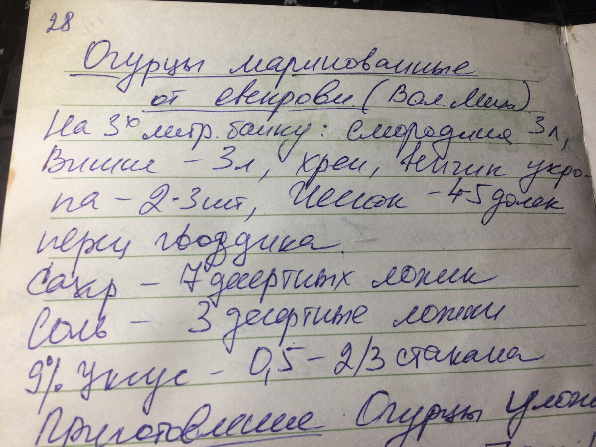 Меня всегда умиляет, когда пишут рецепт от подруги или рецепт от бабушки. Но как это не банально, в моей кулинарной книге этот рецепт обозначен именно так. Ну а раз я решила делится рецептами из своей кулинарной книги - пусть название так и останется. Свекровь у меня женщина не простая и отношения у нас не совсем гладкие. Но вот с чем не поспоришь - готовить умеет и любит. А если к этому добавить, что всю свою жизнь она летом на грядках и толк понимает и в выращивании и в приготовлении овощей. Есть чему поучиться. Изюминка рецепта в маринаде. Обычно при приготовлении маринованных огурцов соотношение количества соли к количеству сахара примерно равное, она же для огурцов делала маринад, больше подходящий для томатов - соотношение сахара и соли практически 1:2,5 Ингредиенты: на 3-хлитровую банку Какую ложку я называю десертной? - на фото ниже 2 столовые ложки, но одна размером поменьше, а вторая обычная столовая. Под десертной я имела в виду небольшую столовую ложку Приготовление: Огурч