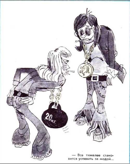 Во внешности это проявлялось, прежде всего, брюками «клёш» и длинными волосами. Приёмник «транзистор» на плече приветствовался особо. Чем громче была музыка, тем лучше. Да, едва ли не главное – обувь на платформе! Достать такие «шузы» можно было лишь у фарцовщиков, и за большие деньги. Кому удавалось, тот возносился на вершину моды. По поводу подобной обуви и одежды в целом ходило много шуток. Журнал «Крокодил» неустанно высмеивал модников. Вот одна из множества карикатур: