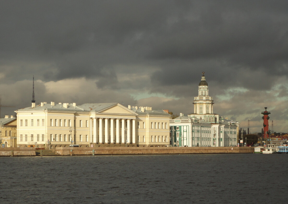 Здание Академии наук на Университетской набережной построено согласно проекту планировки Васильевского острова 1767 года. Первоначально предполагалось, что оно будет повторять облик дома, находящегося по другую сторону от Кунсткамеры - дворец Прасковьи Фёдоровны. Таким образом на берегу Невы должна была возникнуть архитектурная композиция из здания Кунсткамеры в центре и двух одинаковых боковых корпусов. Однако, сразу после утверждения проекта реализовать его не удалось. Участок к западу от Кунсткамеры был передан Академии наук в 1783 году. Тогда же архитектор Джакомо Кваренги создал соответствующий проект, который начал реализовываться уже в августе. Вчерне дом был готов к 1787 году. Построенное Кваренги здание Академии наук стало символом классического стиля в архитектуре Санкт-Петербурга. Длина его фасада 100,97 метра. "Хотя оно и ныне ещё внутри не совершенно отделано, однако помещены уже в новом академическая канцелярия, книжная лавка, книжные магазины, инструментальная, словолит