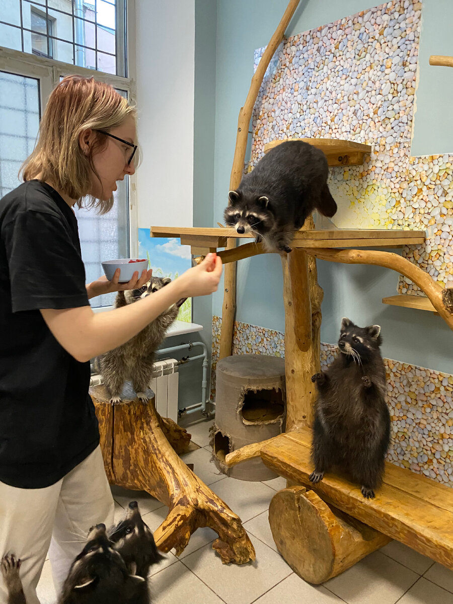 Культурная столица, музеи, театры, белые ночи, мосты и прогулки по каналам. Всё отлично. Но вот, в какой-то момент стало известно, что в Питере есть — ни много ни мало — Енотвилль! Место, где живут одомашненные еноты(!), и где, как было сказано в описании, они там главные. Я, хоть уже и не веган, но всё же не любитель зоопарков, цирков и прочих дельфинариев. Но разнообразия ради, поперла к енотам супруга и двоих старших. Заходишь с Садовой улицы во вполне себе Питерскую парадную, любуешься лепниной и гипсовыми купидонами, поднимаясь на второй этаж, и вот, уже узнаешь, что в переделанной квартирке разделены две коммуны енотов 🦝 В одной комнате живет 5 зверей, в другой – 6. Есть еноты-отказники (кто-то взял в качестве питомца, не справился с управлением и сдал куда было можно), есть еноты из питомников. Животные содержатся в чистоте. Но… на кафельном полу и в комнате. В небольшой такой комнате. Посетителям предлагается послушать всякое про зверушек и покормить енотов кусочками