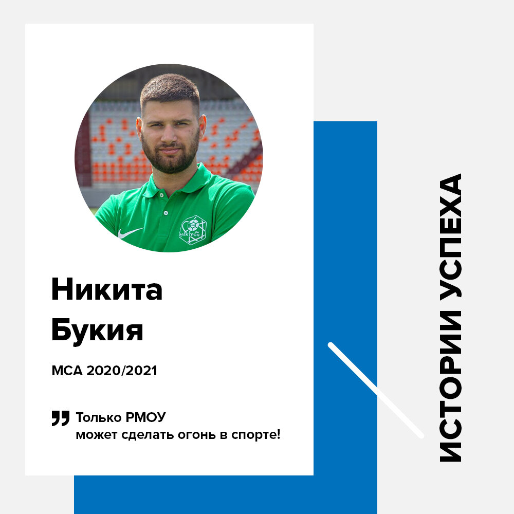 Из хоккея в футбол? Наши выпускники могут себе и такое позволить. Своей историей поделился Никита Букия. Никита ― профессиональный игрок в хоккей, чемпион первенства Молодежной хоккейной лиги. Год назад он окончил программу МСА, а сейчас ― президент футбольного клуба «Электрон» из Великого Новгорода: «РМОУ ― это прекрасные знакомства в индустрии, полезные знания, лучшие специалисты, современные кейсы и невероятная атмосфера. Туда хочется возвращаться снова и снова. После обучения планировал работать на больших международных спортивных мероприятиях, участвовал в оргкомитете Х фестиваля Ночной хоккейной лиги, поэтому остался в Сочи и ждал шанса. Шанс выпал! Теперь я в Великом Новгороде! Уверен, что получится реализовать все свои идеи в деле и сделать «Электрон» узнаваемым брендом». И традиционный совет для абитуриентов: «Это будет великолепный, очень яркий и запоминающийся год. Учитесь, общайтесь, дружите, кайфуйте от Сочи и берите от жизни все. Не сидите не месте, не стесняйтесь и н
