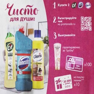 Чисто для души Чтобы принять участие в рекламной акции Чисто для души необходимо с 24 августа по 20 сентября 2022 года: 1. Купите 2 продукта участника акции Cif, Domestos, Glorix; 2. Получи гарантированный приз за 1 рубль; 3. Зарегистрируйте покупку на сайте акции https://www.promonado.ru/; 4. Выигрывайте призы. Призовой фонд: