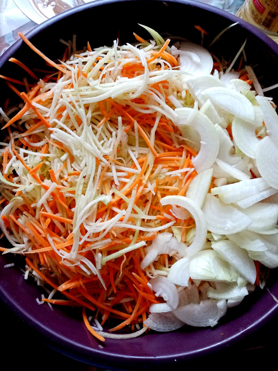Всем заглянувшим доброго времени суток! Рада приветствовать вас на своём канале)) У нас продолжатся лето, а у меня заготовки)) Сегодня хочу поделиться ещё одной вкусной заготовкой на зиму: "Маринованные кабачки с морковью" Кабачков у меня наросло (да и ещё растут) предостаточно, так что - крутим банки. Для приготовления этого салата нам понадобятся: Приготовление: Кабачки и морковь натереть на терке для моркови по-корейски, лук нарезать полукольцами, сложить в кастрюлю Теперь готовим острый маринад: кориандр чуть растолочь, добавить к нему паприку, чёрный перец, пропущенный через пресс чеснок, масло, соль, сахар, уксус. Всё хорошо перемешать. Маринад добавить к кабачкам, луку и моркови, хорошо перемешать деревянной лопаткой и оставить мариноваться на 5 часов, а лучше на ночь. Если оставляю на ночь, то ставлю кастрюлю в холодильник. В этот раз я мариновала 5 часов, периодически перемешивая, салат очень уменьшается в объёме и выпускает много сока. Такой салат можно кушать в свежем виде