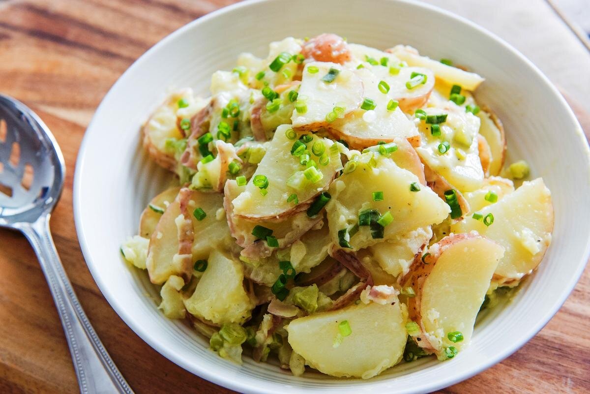 Картофельный салат — популярное блюдо европейской кухни, преимущественно немецкой и австрийской. Подаётся как холодная закуска или в качестве гарнира. Также салат употребляется в качестве вегетарианского, постного и диетического блюда. Салат невероятно сытный, простой в приготовлении и достаточно бюджетный. Ингредиенты: ✔Картофель – 400 г; ✔Репчатый лук – 1 шт; ✔Маринованный огурец – 2 шт; ✔Уксус – 2 ст.л.; ✔Растительное масло – 4 ст.л.; ✔Горчица – 1 ст.л.; ✔Соль, перец Приготовление: Картофель отвариваем в кожуре. Лучше всего использовать картофель небольшого размера и не крахмалистых сортов. Если у вас маленькие клубни, то можно использовать их целиком. После остужаем до комнатной температуры и режем на кусочки среднего размера. Добавляем к картофелю порезанный кольцами лук, огурцы, специи (перец и соль). Все ингредиенты необходимо перемешать между собой. Важно! В первую очередь салат должен пропитаться специями (перец и соль), а только потом можно заправлять блюдо соусом. Для