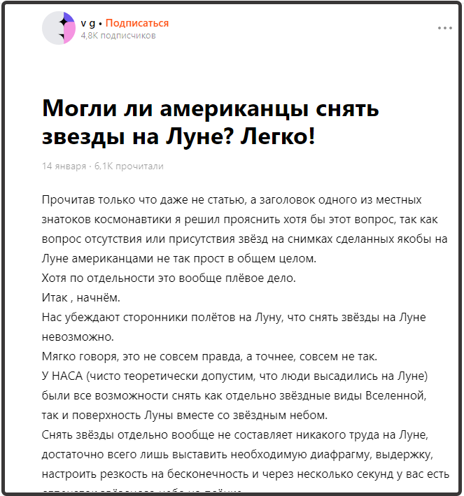 Далее суть посыла ВГ в том, что астронавты могли, но не стали снимать... Могли взять штатив, разные фильтры, штативные головки с часовым механизмом, стать в тень, выставить камеру на несколько минут.... Могли. Если бы им на Луне больше нечего было делать. Они бы тогда непременно стали делать селфи на фоне всего чего можно и выкладывать получившиеся фотки в каком-нибудь тиктоке или инстаграмме. Но конспирологам не ведомо в силу незнания материальной части, что астронавты на Луне знали чем заняться. У них был очень наполненный график работ, который они едва успевали выполнить, а часто и не успевали. И вот точно там не было выделено времени на селфи на фоне лунных небес. Установка штатива, штативной головки с часовым механизмом. Кстати, где у ВГ штатив? У него все проще: