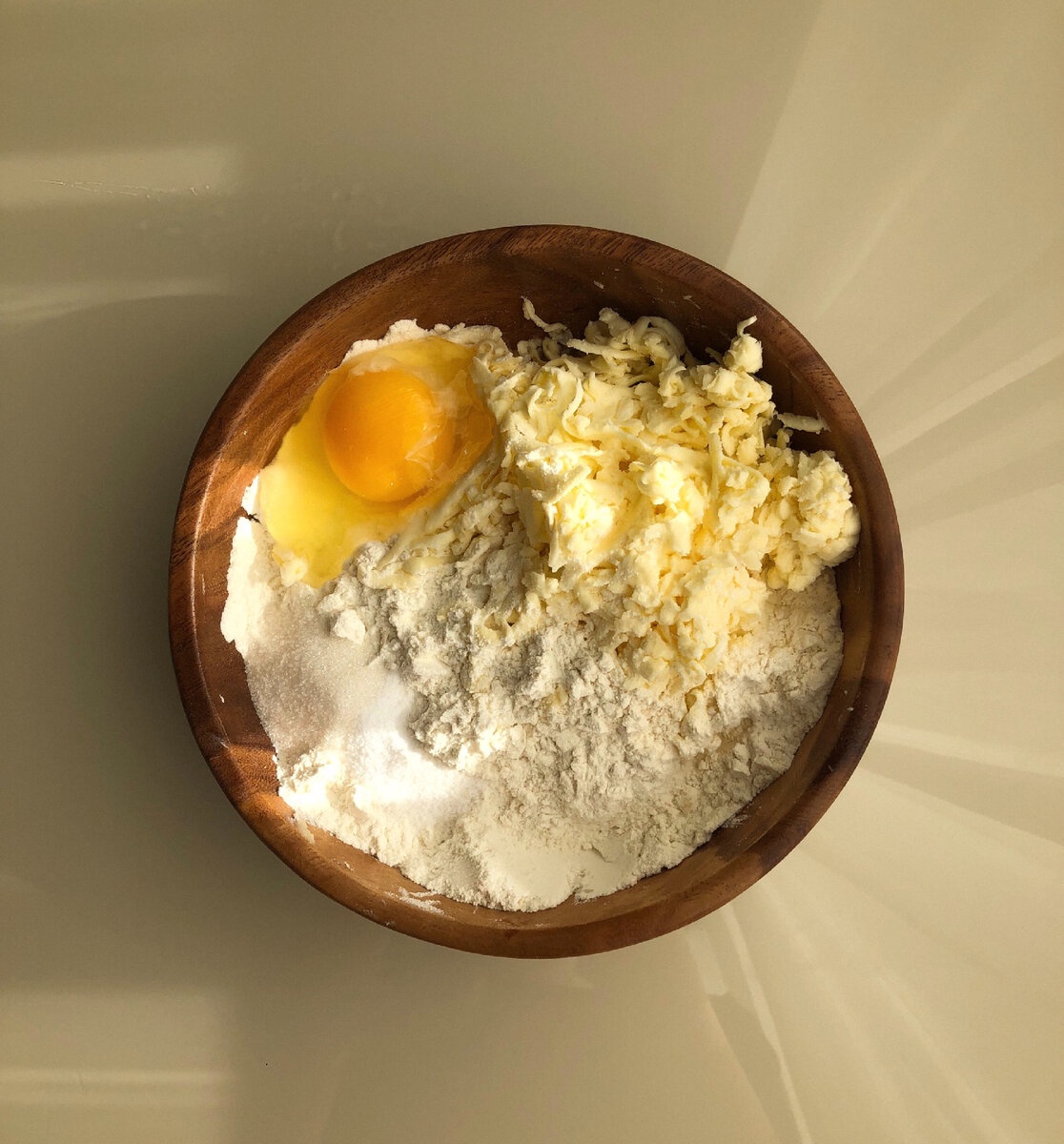 Просеиваем в миску муку и натираем в нее на крупной терке холодное сливочное масло.