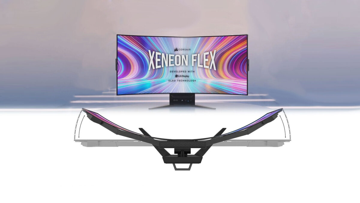 В Xeneon Flex используется 45-дюймовая гибкая панель LG W-OLED с ручками, выезжающими с каждой стороны. Как бы ни было удивительно видеть, как экран гнется и даже складывается пополам без каких-либо повреждений, мы еще не определились с идеальным вариантом использования гибких OLED-дисплеев. Компания Corsair пробует эту технологию с помощью своего нового игрового монитора Xeneon Flex, который позволяет пользователям сгибать экран с каждой стороны для создания более захватывающего визуального восприятия. Xeneon Flex - не совсем новая идея. Еще на выставке CES 2021 компания LG представила на своем стенде аналогичный прототип с 48-дюймовой гибкой OLED-панелью, которая, при нажатии кнопки, медленно превращалась из абсолютно плоского экрана в экран с плавным изгибом, который лучше заполнял периферийное зрение геймера. Но, как и в большинстве прототипов, демонстрационный образец LG был без ручек. В нем также использовался моторизованный механизм для плавного сгибания и разгибания дисплея. Мо
