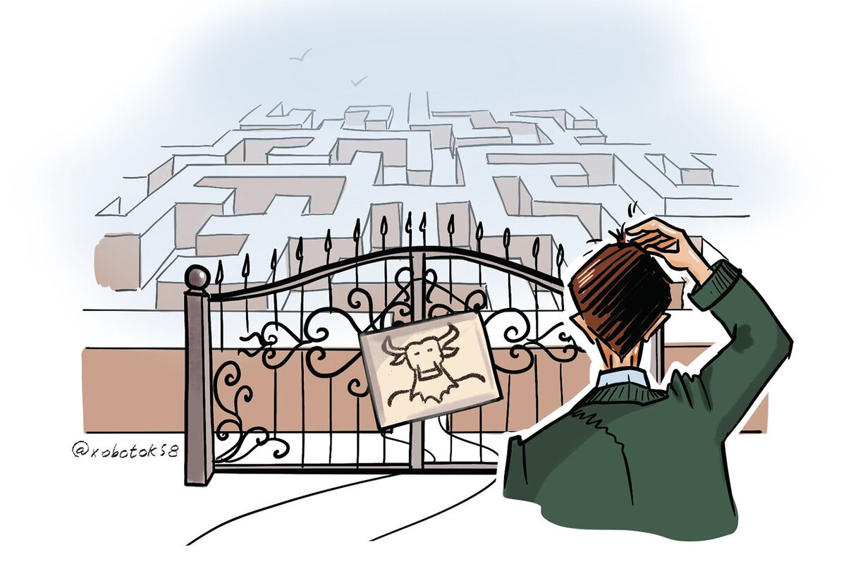 - Черт возьми, что здесь вообще происходит? – чуть не заорал Вова, осмотревшись вокруг. Вместо уютного компьютерного кресла, светящегося монитора и новенького системного блока перед ним стояла огромная скала с выдолбленным в ней отверстием. Это отверстие было закрыто тяжелыми воротами, а все это сооружение украшала огромная надпись «Лабиринт». Вокруг этой колоссальной конструкции не было вообще ничего, только бескрайняя пустыня, простирающаяся до горизонта. Что за ерунда такая? Вова уже и протер глаза, и ущипнул себя, и сильно ударил кулаком по двери, рассчитывая проснуться, но никакого эффекта это не возымело. - Ой, мама! – вскрикнул Вова, и снова уставился на ворота. На них почему-то был приклеен лист бумаги А4, на котором красовалось черно-белое изображение какой-то злой коровы. «Минотавр» – гласила лаконичная надпись на бумаге. Какой минотавр, причем тут минотавр? Слово-то какое-то старое. Глупое. Вова присел прямо на песок перед воротами, и покосился на них. Зачем он здесь, для че