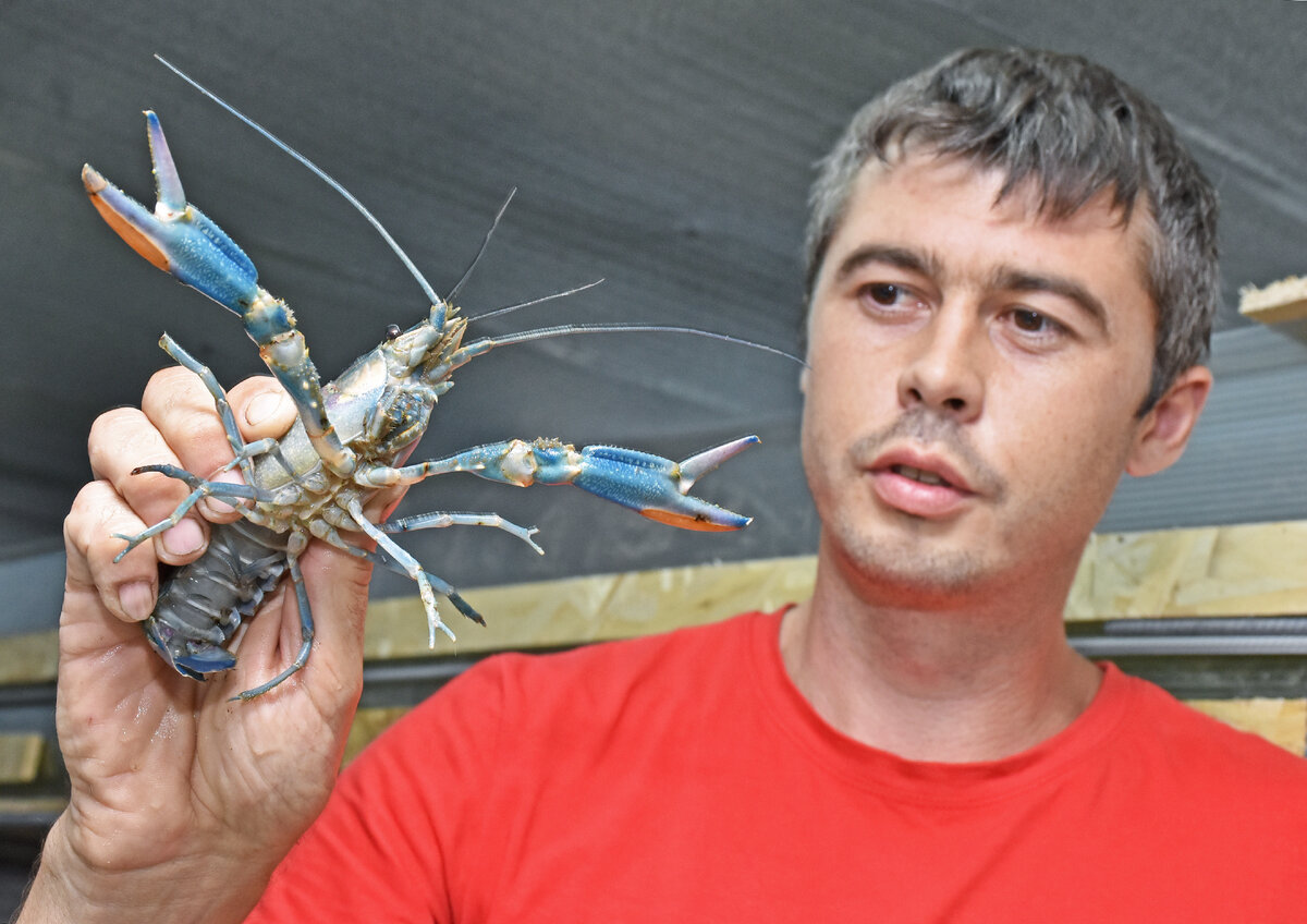 В администрации района очень удивились, когда он пришел в администрацию района с необычным бизнес-планом – создание мини-фермы по разведению синих австралийских раков. Хотел получить господдержку по соцконтракту. Чиновники засомневались в результате, но Ринат с таким воодушевлением рассказывал о задуманном, что решили дать человеку шанс. Булатов получил 250 тысяч на развитие своего дела и принялся обустраивать акваферму. Ну как журналистам не посмотреть на такую экзотику? Входим в переоборудованный сарайчик, где на длинных стеллажах расположились аквариумы с подсветкой. Хозяин смастерил их своими руками. В помещение проведено отопление – чтобы австралийские раки не впали в спячку, а хорошо росли и набирали вес, необходима плюсовая температура. В аквариумах – и большие раки, и совсем крошечные. Всего – около 500 штук. Малышей не сразу заметишь в воде, только глаза-бусинки чернеют. – А вот этому красавцу четыре года, – показывает взрослую особь Ринат. Вытащенный из воды обитатель грозно