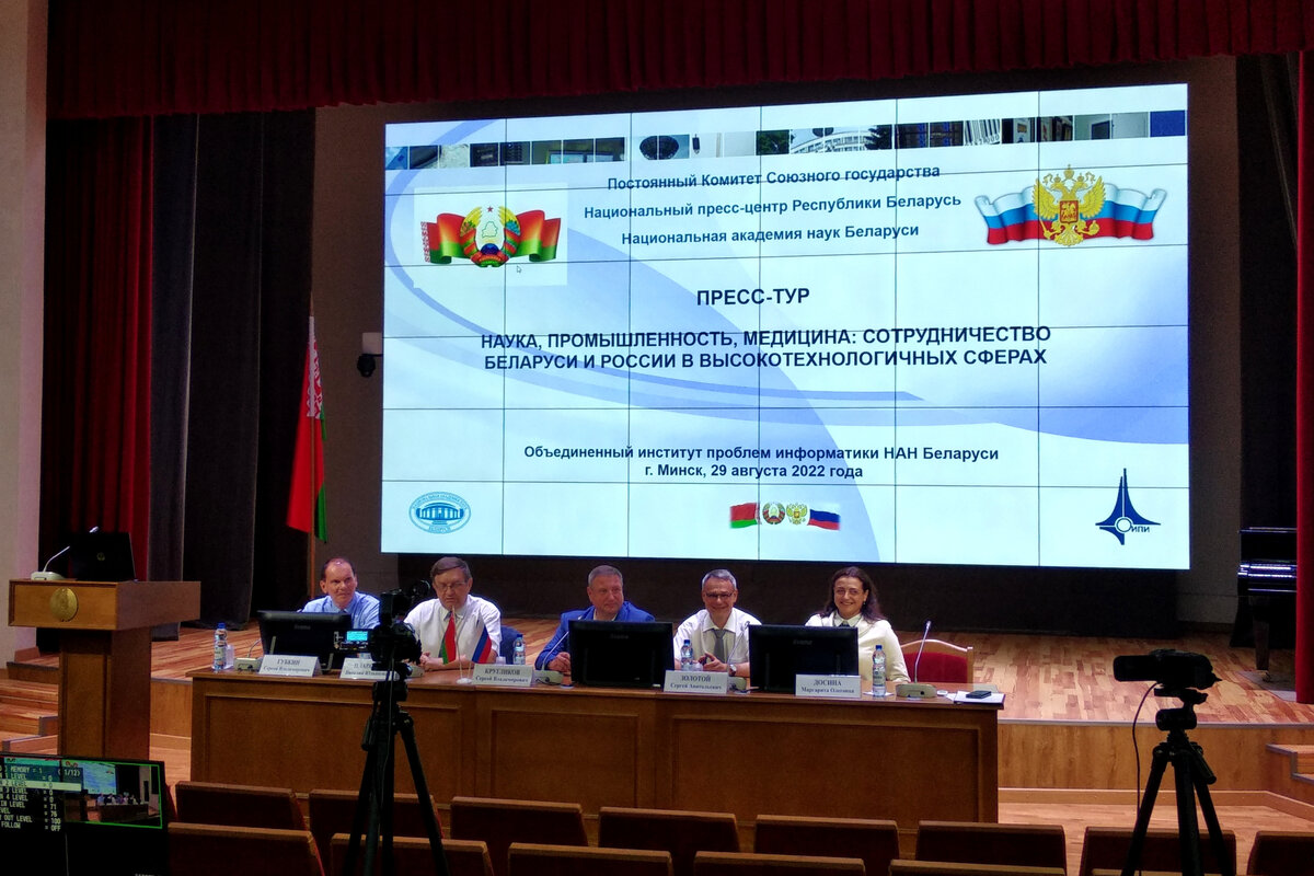 В Минске стартовал трехдневный союзный пресс-тур с участием СМИ Республики Беларусь, Российской Федерации и союзных медиа. Одним из главных событий первого дня стал круглый стол «Наука, промышленность, медицина: сотрудничество Беларуси и России в высокотехнологичных сферах". На вопросы журналистов ответили компетентные представители президиума НАН, Института физики им. Б. Степанова, Института физиологии, предприятия "Геоинформационные системы". Позже для представителей СМИ была проведена экскурсия по Институту проблем информатики НАН Беларуси, в рамках которой журналисты увидели суперкомпьютерный центр, побывали в центре планирования космической съёмки, центре управления полётами, а также поднялись на крышу института, чтобы своими глазами увидеть 14-тонный приёмный комплекс, который обеспечивает получение информации с российско-белорусских спутников. Впереди знакомство с БЕЛАЗом и МТЗ, а также, передовыми разработками белорусских медиков, в том числе в рамках выполнения сою