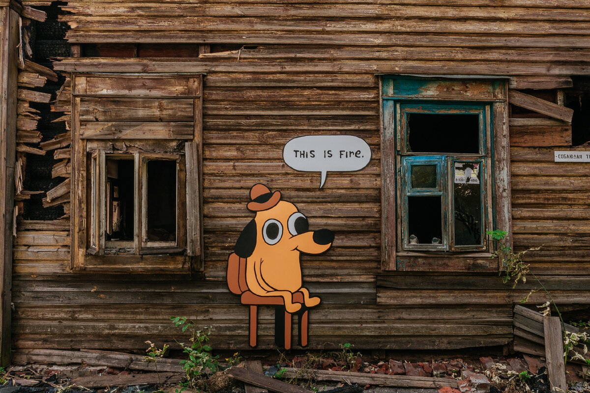 Работа выполнена в рамах фестиваля Карт-бланш. В работе перерисован и доосмыслен мем про собаку, которая сидит в горящей комнате и говорит This is fine.
