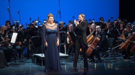 В зале — публика, явно не принадлежащая к числу заядлых меломанов. Статус мероприятии и цены на билеты априори отсекают львиную долю почитателей оперы. Для такой аудитории что нужно? Что-нибудь популярное, известное, яркое.