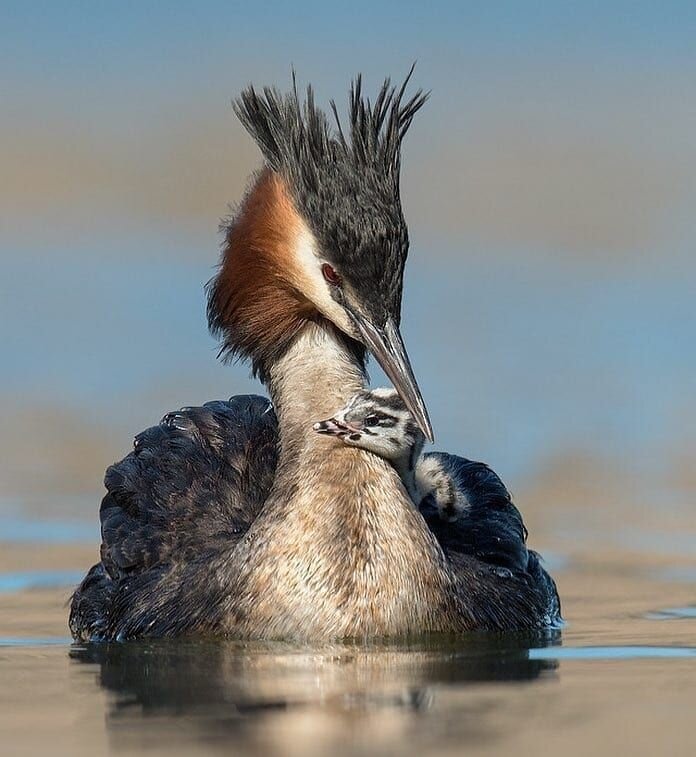 Чомги- самые большие поганки в Европе. Оперение на спине и боках пестрое коричневого цвета. Задняя часть шеи темно-коричневая, а передняя часть шеи и нижняя сторона белые. У них длинные шеи и красновато-оранжевые перья с черными кончиками на головах. Эти перья присутствуют только в период размножения, они начинают развиваться зимой и полностью развиваются к весне. У птиц также есть эректильные черные гребни на макушке головы, которые присутствуют круглый год. У чомг короткие хвосты и ноги, отведенные далеко назад для эффективного плавания. У юных птиц на щеках черные полосы Распространение В Сибири гнездится в степи, лесостепи и на юге лесной зоны, распространение неравномерное, часто очень локальное. Биология Прилетают с мест зимовки раньше других поганок, нередко еще до схода льда, при больших заберегах, многие — уже сформированными парами. Гнездовые местообитания — озера и пруды средней величины и крупные, хотя бы с небольшими зарослями тростника и других растений, с большими плеса