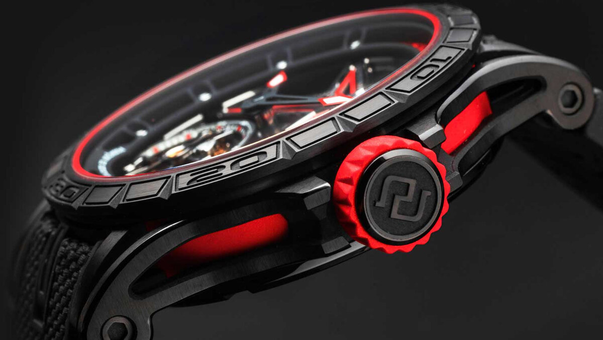 Бренд Roger Dubuis известен смелыми дизайнами больших скелетонированных наручных часов. Мощная культовая коллекция Excalibur — знаменитая платформа для экспериментов Роджера Дюбуи. Бренд празднует партнерство с Pirelli и возвращает экстравагантный стиль. К юбилею в каталоге компании появилась новая фантастическая интерпретация Excalibur Spider в уменьшенном формате. Умеренные размеры корпуса Коллекция Excalibur — это линейка часов с уникальным дизайном, которые приковывают взгляд экзотическим циферблатом. Швейцарский производитель часов выводит Excalibur на новый уровень, используя сложный механизм с турбийоном, чтобы поддерживать точность на функциональном уровне. В сотрудничестве с Pirelli компания демонстрирует Excalibur Spider Flying Tourbillon. Сотрудничество с автогигантом в выпуске новой модели бросает вызов техническим трудностям, используя высококачественные материалы и новейшие технологии. Новые часы Roger Dubuis Excalibur Spider 39 Flying Tourbillon RDDBEX0817 с парящим турб