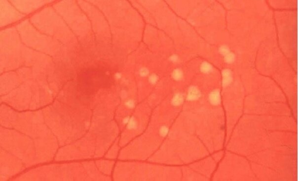 Patients with untreated AIDS who have CD4 counts <50/mm3 are at high risk for cytomegalovirus (CMV) retinitis. Suspicion is often raised when a patient with advanced AIDS develops slowly progressive blurred vision, scotoma (blind spots), floaters, or photopsia (flashing lights). Although most cases are thought to arise due to hematogenous dissemination of CMV, serum testing for the virus is often (~50%) negative. Therefore, the diagnosis is typically established when funduscopy reveals yellow-white, fluffy retinal lesions near the retinal vessels associated with hemorrhage.