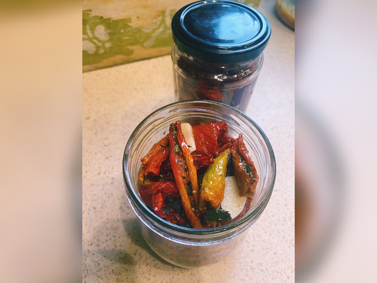 Такие вяленые помидоры могут храниться в холодильнике до полугода, если вы их не съедите сразу после приготовления)) Их хорошо добавлять в пиццу, салат, пасту или просто же на бутерброд. Идеально подойдут помидоры черри или небольшие сливки. У меня были крупные помидоры и они оказались ничем не хуже! Помидоры разрезаем пополам или как в моем случае- на несколько частей и удаляем плодоножку и семечки. Я вялила в этот раз в сушилке для овощей, если у вас ее нет, смело используйте духовку. В этом случае помидоры укладывайте на противень в один слой. У меня в сушилке были заполнены пять уровней. Далее посыпаем помидоры смесью прованских трав, солью и сбрызгиваем оливковым маслом( подойдет и любое другое растительное). В духовке оставляем помидоры при 130 градусах на 3-4 часа. В сушилке для овощей они стояли у меня на 70 градусах около 6 часов. Готовые помидоры убираем в банки, перекладываем пластинками чеснока и заливаем маслом.