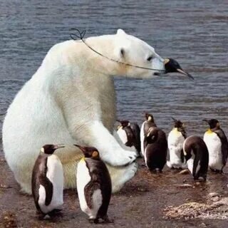Если вдруг белый медведь окажется на Южном полюсе, это будет в первую очередь чудом, он не сможет проживать там, так как не приспособлен к окружающей среде. Как известно северный полюс это огромные льдина в которой протекают полыньи, за их счëт медведь и добывает пропитание. Однако на южном полюсе таких условий нет, ведь это участок суши и фактически льды расположены на земле. С пингвинами та же ситуация. К тому же, в природе белый медведь это серьëзный хищник, а пингвины возможная добыча.