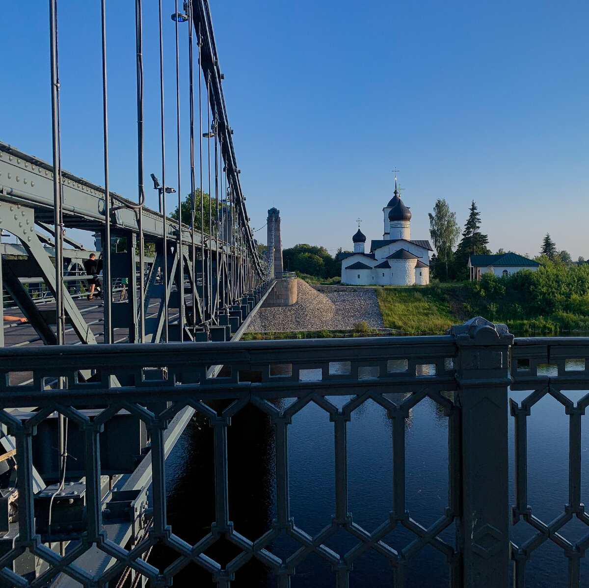 Псковская область. Цепные мосты - уникальный памятник строительной техники и архитектуры. До сооружения постоянных металических мостов сообщение, между берегами реки Великой в Острове, осуществлялось паромами, а также по легкому временному деревянному мосту на козлах. Необходимость строительства постоянных мостов была вызвана прокладкой через него в 1830-х годах Динабургского шоссе от Санкт-Петербурга до Динабурга ( ныне Даугавпилс, Латвия). Проект моста был утверждён в 1848 году, строительство началось в 1851, но в результате мощного паводка в этом же году был выбран новый проект капитан-инженера М.Я. Краснопольского, который утвердили в 1852. Из-за чувствительности мостов к динамической нагрузке в 1853 году было разработано особое положение «Положение о движении по цепным Островским через рукава р. Великой мостам» движение было открыто 3 ноября 1853 года, но ещё раньше 30 сентября, возвращавшийся из Ковно ( ныне Каунас, Латвия) царь Николай I, в присутствии толп народа, прошёл по н