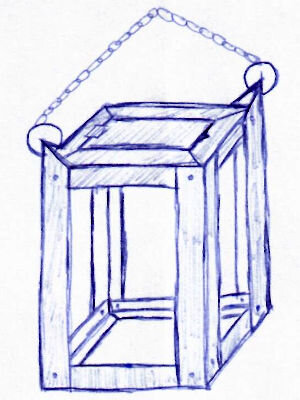 Обратите также внимание на загнутый кверху уголок с отверстием (показан в левой части рисунка) – он предназначен для продевания туда ещё одного витого кольца, чтобы крышка присоединялась к фонарю при помощи коротенькой, всего из двух-трёх звеньев, цепи. Такой вариант крепления (в отличие от петлевого) позволяет снять крышку, а при необходимости – вообще отстегнуть. При изготовлении крышки я также наметил места отверстий для беспрепятственного выхода продуктов горения, что вкупе с притоком воздуха через дополнительные отверстия в нижних частях стоек (см. п. 4) способно обеспечить доступ необходимого количества кислорода для нормального горения свечи.