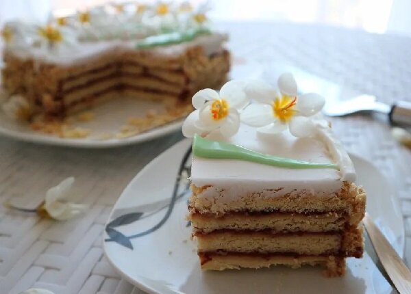 Этот песочный торт — рецепт из старой советской книги под названием «Домашняя всезнайка». Там среди множества советов по хозяйству (и даже по йоге!) был раздел кулинарии. Скажу кстати, что купить такую книгу в те времена было не абы каким везением! А вообще, песочный торт «Ландыш» был распространенным лакомством и продавался в каждой кулинарии. Очень простой в приготовлении, из самых доступных продуктов, этот торт, как и многие другие изделия в советской торговле, сначала был очень вкусным и неизменно вызывал очередь желающих купить его. А позже, когда технология приготовления стала нарушаться, стал обычным невкусным продуктом, который всегда стоял на полках и не вызывал интереса. Недобросовестное приготовление или дефицит масла в 70—80 годы привел к тому, что тесто стали готовить слишком забитым мукой, белесым и непропеченным, варенье из-за дефицита сахара было почти несладким — торт утратил свою популярность и постепенно исчез из продажи. А жаль! Песочный торт «Ландыш» — это одно из